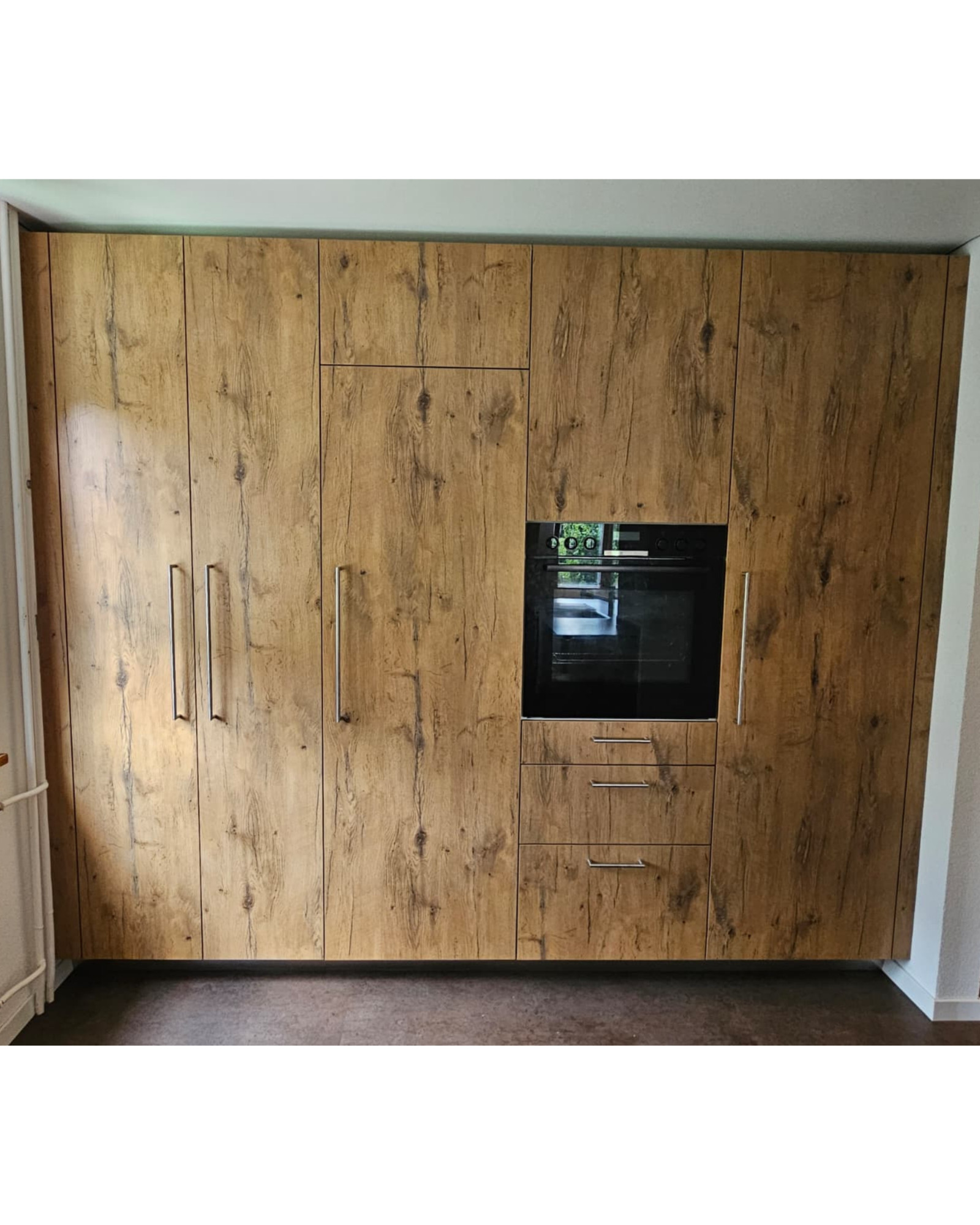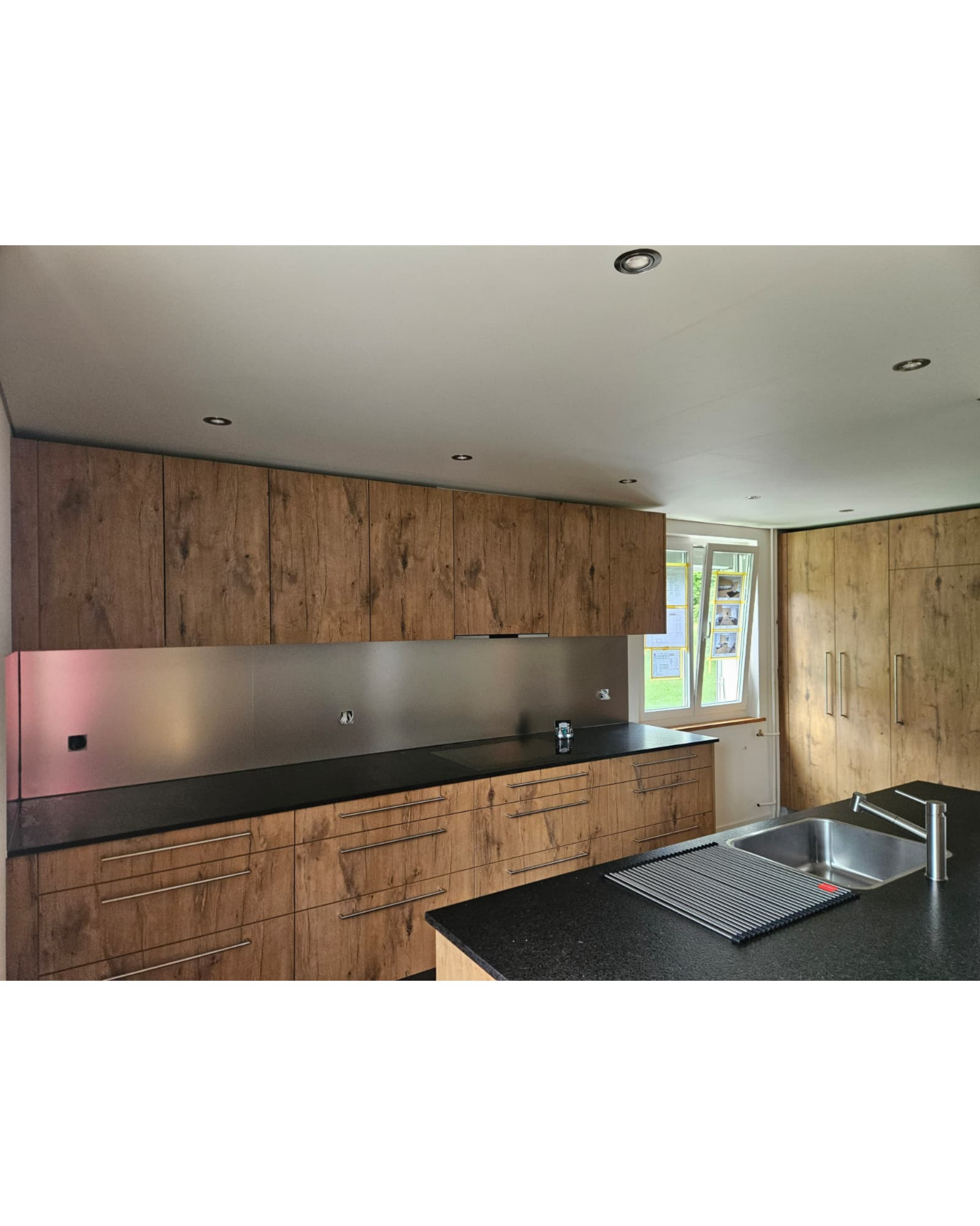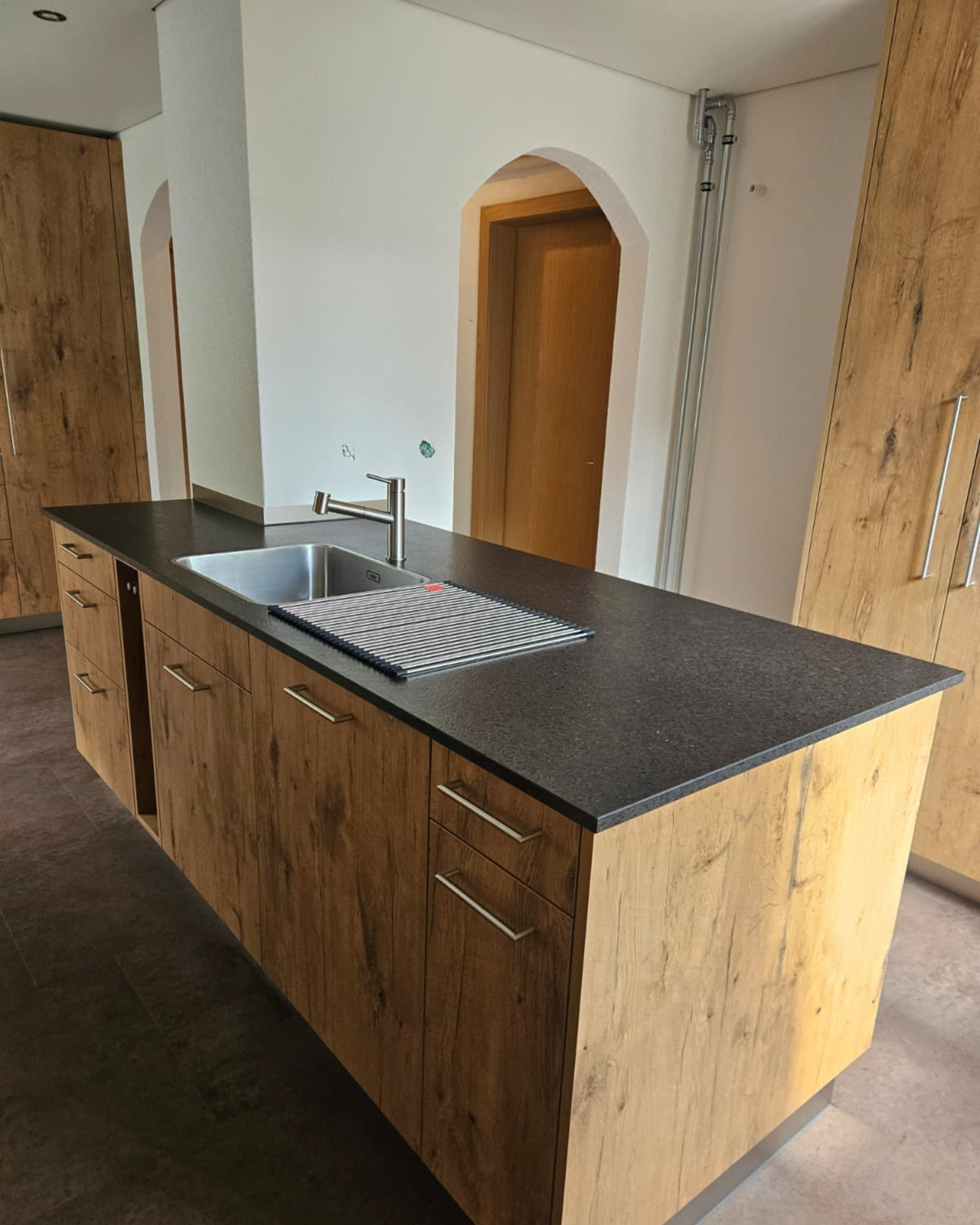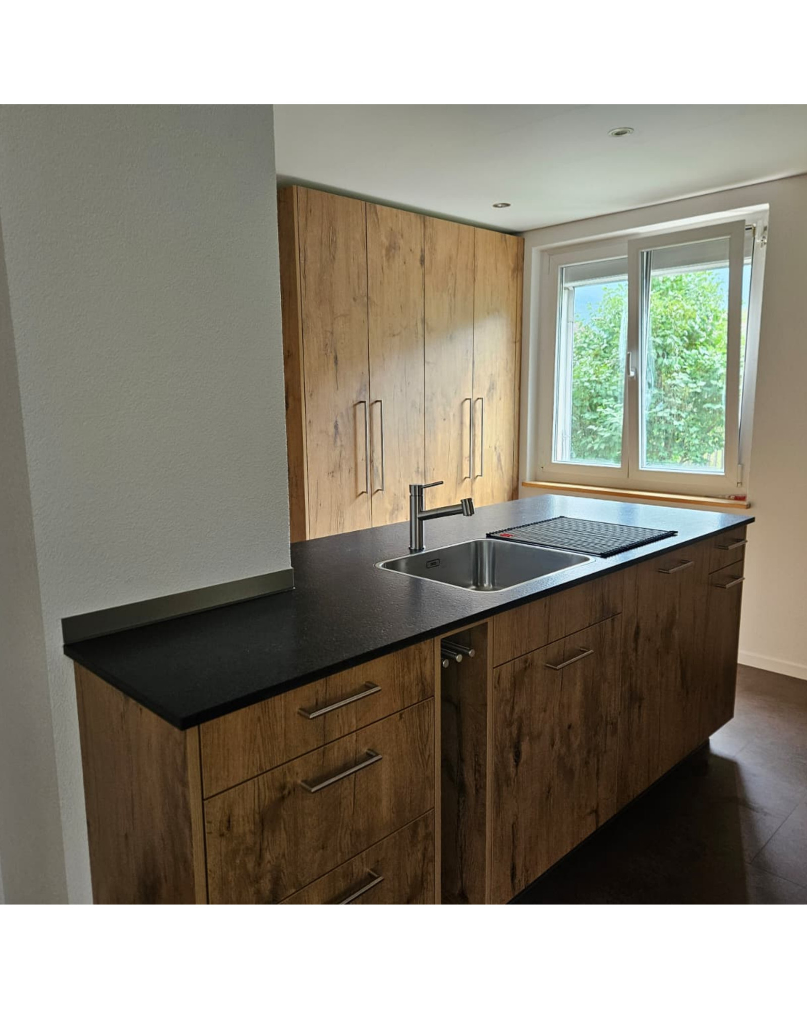 Unsere neueste Kreation für unsere Kundschaft besticht durch Fronten in Eichen-Dekor, eine atemberaubende Granitabdeckung Nero san Marco satiniert und einen modernen Vinylboden in der Küche sowie im Eingang. 🏡✨